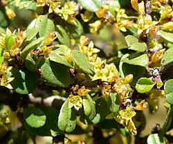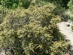 This evergreen shrub is typically 1–2 metres (3+1⁄2–6+1⁄2 ft) in height.[2] The leaves are 1.4 centimetres (1⁄2 in) long. The flowers have four yellow-green sepals and no petals. The fruit is a red berry containing two nutlets.[3]