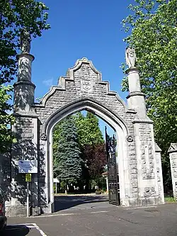 The primary entrance gateway to the cemetery dates from around 1910. The gateway was constructed from coursed rubble and has ashlar dressings. The central archway, the vehicular entrance, is topped with a stepped parapet incorporating the Southampton Civic Shield and flanked by piers on either side. The bases of the piers are square, with two octagonal stages above, and statues of angels on top. Pedestrian entrances are located on both sides of the gateway; each of these entrances has square piers with gabled caps on either side. A low wall of similar construction, around 2 feet high, runs from the gates around the outside of the cemetery.[9] The gates, piers and walls were first listed for their special architectural or historic interest on 8 October 1981 and have grade II status.