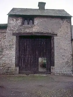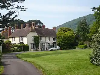 There have been at least four successive mansion houses at Holnicote. Limited information is available about the early buildings. One is known to have been built between 1493 and 1521, based on dendrochronology from surviving timbers. The Grade II* listed gatehouse and attached cottage were built together with a new house in the early 17th century.[86] Following the purchase of the estate by the Blackford family in 1705, a new mansion house was built on the site of the previous structure.[87] Only the stable block from that building survives.[88] The house was destroyed by fire in 1779. The Acland family re-built it as a thatched hunting lodge, which was also destroyed by fire in 1851,[89] and replaced in 1861. A kitchen extension was added in 1874.[87] The lodge was built in the 19th century.[90] The estate includes several cottages including Rose Bower[91] and the 17th-century Butlers Cottage.[92] An 18th-century Flemish bond red brick granary also exists on the estate.[93]