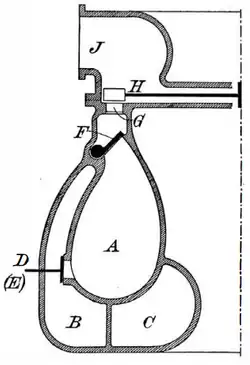 The combustion chamber (A) is filled intermittently with an air–fuel mixture supplied by the gas chamber (C) and the air chamber (B). The air–fuel mixture is ignited by a spark after which the explosion of the mixture causes an increase in pressure throwing open the nozzle valve (F), allowing the compressed gases to flow through the nozzle (G) to the turbine wheel (H) on which the work is to be performed. While passing through the nozzle, the gases are expanded to the pressure of the exhaust (J). The nozzle valve (F) is kept open by fresh air throughout the expansion and subsequent scavenging and cooling.[7][8]