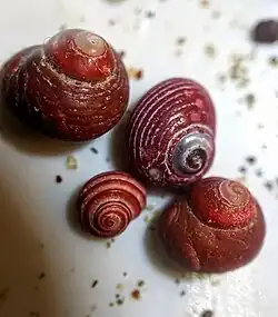 The height of the shell varies between 6 mm and 10 mm. Its color is red, ashen or purple. The small, globose shell is very solid and imperforate. The spire is conic, more or less depressed. The suture is moderately impressed. There are five whorls. These are slightly convex, the last decidedly deflected toward the aperture, encircled by about fifteen subequal spiral lirae, separated by interstices about as wide as the ridges. The incremental striae are generally strongly developed, causing the liree to appear nodose or somewhat irregular, and the interstices to appear pitted. The oblique aperture is pearly white within. It measures about half the length of shell. The columella is arcuate. The base of the shell is obsoletely uni- bi- or tri-dentate. The rounded oval operculum is nearly smooth and slightly concave in the middle.[4]