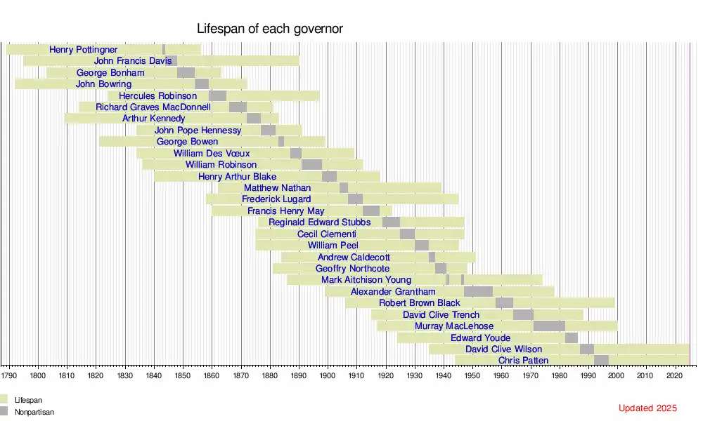 | 10 | | Sir William Des Vœux 德輔 (1834–1909) | 6 October 1887 | 7 May 1891 | 3 years, 213 days | Baden-Baden, German Confederation | Colonial administrator | [25] |