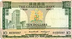 The ten-dollar note was first produced in 1868 by The Hongkong and Shanghai Banking Corporation with the formal adoption of a currency system just for Hong Kong. There had been a variety of the green coloured ten-dollar notes issued by several banks concurrently. These were all phased out with the introduction of the ten dollar coin in 1994.