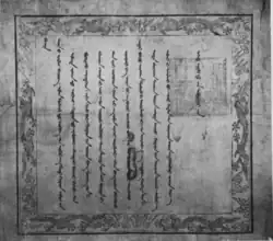It is unclear whether "Hong Taiji" was a title or a personal name. Written Hong taiji in Manchu, it was borrowed from the Mongolian title Khong Tayiji.[1] That Mongolian term was itself derived from the Chinese huang taizi 皇太子 ("crown prince", "imperial prince"), but in Mongolian it meant, among other things, something like "respected son".[2] Alternatively, historian Pamela Crossley argues that "Hung Taiji" was a title "of Mongolian inspiration" derived from hung, a word that appeared in other Mongolian titles at the time.[3] Early seventeenth-century Chinese and Korean sources rendered his name as "Hong Taiji" (洪台極).[4] The modern Chinese rendering "Huang Taiji" (皇太極), which uses the character huang ("imperial"), misleadingly implies that Hong Taiji once held the title of "imperial prince" or heir apparent, even though his father and predecessor Nurhaci never designated a successor.[5]