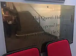The conversion of the hall was completed in time for its official opening by Elizabeth II on 6 July 1979.[32] Work on the building continued subsequent to its opening. Further works included the opening of the Canada Room in 1982, now known as the Tunnell Room; the addition of a mezzanine level to the former hall in 1991; and, in 1996, the installation of a piano lift, new lighting, and carpets along with the refurbishment of the seating.[33]