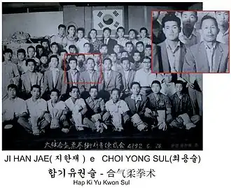 The birth of modern hapkido can be traced to the efforts of a group of Korean nationals in the post-Japanese colonial period of Korea: Choi Yong-sool (최용술) (1904–1986) and his most prominent students; Chinil Chang, his personally chosen successor, Seo Bok-Seob, the first student of the art; Ji Han-jae (born 1936), one of the earliest promoters of the art; Jung Hwan Park, a long time student of Choi; Kim Moo-hong, a major innovator; Myung Jae-nam, a connector between the art of hapkido and aikido; and Myung Kwang-sik the historian and ambassador, all of whom were direct students of Choi or of his immediate students.[2][3]