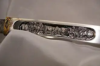 Horimono (彫り物, 彫物, literally carving, engraving), also known as chōkoku (彫刻, "sculpture"), are the engraved images in the blade of a nihonto (日本刀) Japanese sword, which may include katana or tantō blades.[1] The artist is called a chōkokushi (彫刻師), or a horimonoshi (彫物師, "engraver").