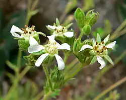 This is a perennial herb forming clumps of long, fernlike leaves and erect stems. The leaves are up to 18 centimeters long and are made up of triangular to rounded leaflets, each toothed or lobed and covered in thin hairs. The narrow stems reach 10 to 50 centimeters in height and bear inflorescences of several flowers. Each flower has hairy, lance-shaped bractlets and pointed sepals. The narrow oval petals are white. The center of the flower contains ten stamens and up to 50 pistils.
