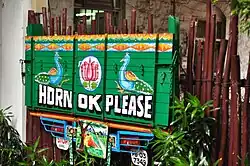 Horn OK Please or Sound Horn is a phrase commonly painted on commercial vehicles like trucks, buses and local taxis in India,[1][2] to alert drivers of vehicles approaching from behind to sound their horns if they wish to overtake.[3] This phrase is often displayed using South Asian truck art.