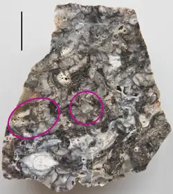 Surface view of a polished piece of Rhynie chert showing many corms/tubers of Horneophyton. Marked examples: centre – single corm with rhizoids; left – linked corms with rhizoids. Scale bar is 1 cm.