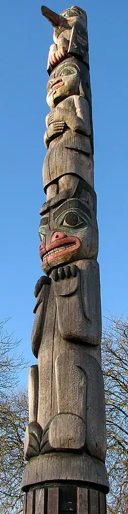 A 20 ft (6.1 m) totem pole, carved from red cedar, stands outside the museum's main entrance. It was carved in 1985 as part of the American Arts Festival by Nathan Jackson, a Tlingit native Alaskan. The carvings on the pole depict figures from Alaskan legend of a girl who married a bear, with an eagle (Jackson's clan crest) at the top.[16] The pole is one of only a handful of totem poles in the United Kingdom, others being on display at the British Museum, the National Museum of Scotland in Edinburgh, Windsor Great Park, Bushy Park, the Yorkshire Sculpture Park, the Pitt Rivers Museum at Oxford, and at Alsford's Wharf in Berkhamsted.[17] There is also a totem pole in the Royal Albert Memorial Museum in Exeter. It is displayed in their World Cultures galleries.