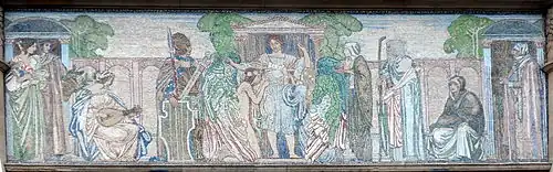 On the London Road wall of the main building is a neoclassical mosaic mural entitled Humanity in the House of Circumstance, designed by Robert Anning Bell and assembled by a group of young women over the course of 210 days. Composed of more than 117,000 individual tesserae, it measures 10 ft × 32 ft (3.0 m × 9.8 m) and symbolises personal aspirations and limitations.[14]
