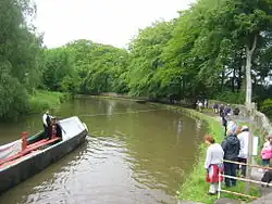 On 4 August 2006, Robin Evans, Chief Executive of British Waterways, joined horseboat Maria at Portland Basin, where the Lower Peak Forest Canal meets the Ashton Canal. Maria is Ashton Packet Boat Company's flagship narrowboat and Britain's oldest surviving wooden narrowboat, built in 1854 by Jinks Boatyard in Marple, and still horsepowered to this day, i.e. permanently without an engine.[2] He took part in a taster session of driving boathorse Queenie along a section of the canal, and he proceeded to take Maria through Hyde Bank Tunnel by legging the boat from the cabin roof. This journey was also notable since Maria used to carry limestone (1854 to ca. 1904) from Bugsworth Basin to Ashton-under-Lyne, and the Society chose to commemorate this by re-enacting the journey, more than 100 years later.[3]
