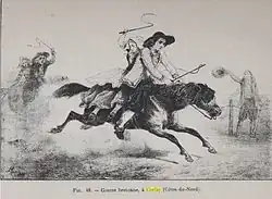 In 1819, the director of the Haras National de Langonnet commented on his difficulties in finding good stallions in the region.[88] Ephrem Houël ran the Langonnet stud from 1838 to 1847. In his Traité complet de l'élève du cheval en Bretagne (1842), he testifies to the central place this animal occupies in Breton life. Even the poorest peasants are obliged to own at least one horse.[89] Farming, public carriages, road transport and city services are all carried out by local horses.[90] Peasants go to pardons, christenings, funerals, pleasures and family affairs on horseback. According to Houël, riding is especially de rigueur at weddings.[89] In the mountainous regions of inland Brittany, where roads are poor, the use of packhorses remains important.[91] In the middle of the century, Jean-François Brousmiche testifies to the care these farmers lavished on their horses: it was not uncommon for them to be sheltered in the house in winter. They prepared the animals' feed "with as much or even more care than their own".[92] Horse-drawn vehicle was often harsh. Some horses die between their harnesses. In the hills, stagecoach passengers dismount to relieve the animals. Animals pulling as far as Saint-Brieuc are sometimes "doped" with Calvados.[93]