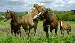 Originating in mountainous areas, the Centre-montagne is the smallest variety of the Breton breed. It was officially recognized in 1927 and descended from the bidets.[40][182] It disappeared in the 1980s, due to its low meat yield.[183] The Postier type is the "jewel of the breed", considered one of France's most precious zoological heritages.[42] Its name derives from its historic use to pull post office wagons. It is the result of crosses between Léon mares and Norfolk and Hackney trotter stallions in the early 20th century.[184][185] The Postier Breton made a name for itself in 1905 at the Concours Central Hippique de Paris.[186] Lighter and broader in gait than the draft,[42] measuring around 1.55 m, it is bred mainly in central Brittany. It is a good carriage horse for light draft work.[176] The Trait is the result of crossbreeding with Ardennais and Percherons, notably the half-Ardennais Naous.[187] The Breton Trait is very strong for its size, topping out at around 1.60 m.[179] Now bred almost exclusively for meat, it is the breed's most common type, weighing up to a ton.[42]