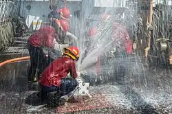 Eagle has a standing permanent crew of seven officers and 50 enlisted members; on training missions, she takes on a variety of temporary crew and sails with an average complement of 12 officers, 68 crew, and up to 150 trainees.[21] While on board, cadets and officer candidates receive a large amount of instruction from the crew. They take classes on numerous subjects that are key to life at sea, including navigation, seamanship, ship and boat maneuvering, line handling, sailing, first aid, weather patterns, damage control, engineering, career development, and more. They also stand watches in the engine room, on the bridge, on deck, in the scullery and galley, and during port calls, they assist the public by giving tours. The trainees are expected to qualify in a variety of watchstations applicable to their level of experience; for example, third class cadets complete their 'helm and lookout' qualification while upper-class cadets work to qualify in leadership positions on the bridge and in the engine room. At the same time, trainees are given a rigorous set of nautical tasks they must complete. One common training task involves the Eagle crew covering all Global Positioning System receivers on board and requiring trainees to navigate between ports using sextants, a compass, and the tools of celestial navigation.[22][23]