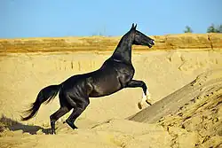 Veterinarian Kristin J. Holtgrew-Bohling's glossary (second edition 2014) describes "hot-blooded horses" as animals whose pedigree can be traced back to horses originating in the deserts of North Africa and the Mediterranean Sea, and this author broadly includes breeds, such as the Thoroughbred, Standardbred, Quarter Horse, and Tennessee Walker.[17] This is the case for the Karabakh,[18] the Anglo-Arabian,[19] the Hanoverian and the Mecklenburger horse in Germany.[20] The Namib horse was described as hot-blooded, before a genetic study demonstrated its proximity to the Arabian.[21]