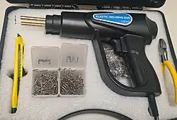 A plastic repair welder (also called hot stapler, bumper welder, or metal insert welder ) is a power tool designed to repair thermoplastic plastic parts by inserting heated metal staples. [1] It is widely used in body shops, plastics manufacturing and repair industries, as well as in domestic applications to restore damaged components, replacing hot air welding or adhesives or even ultrasonic welding. [2]