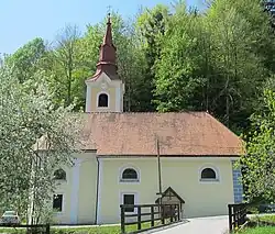 The local church is dedicated to Saint Lawrence. It stands at the foot of White Hill (Slovene: Bela) opposite a bridge over Kopačnica Creek, southwest of the core of Hotavlje. The church was first mentioned in a land register dating to 1501[11] and then in visitation records of the Counts of Gorizia dating to 1520, but its angled apse indicates a gothic origin. The simple rectangular nave dates to around 1705. The belfry was built in 1630 and made taller in 1718. The main altar bears the years 1792 (probably when it was made) and 1901 (probably when it was renovated).[11] It is dedicated to Saint Lawrence and Saint Cantianius.[11] The side altars, dedicated to Saint Roch and Saint Clement, as well as the depictions of the Stations of the Cross, are from the late 18th century.[12][13]
