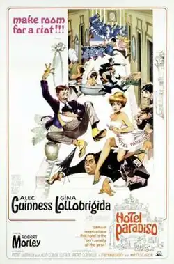 Hotel Paradiso is a 1966 British comedy film released by Metro-Goldwyn-Mayer in Panavision. It was directed by Peter Glenville and based on the play L'Hôtel du libre échange by Maurice Desvallières and Georges Feydeau. The film allowed Alec Guinness to reprise the role he had played in the London West End theatre production of Hotel Paradiso, which opened at the Winter Garden Theatre, Drury Lane, London on 2 May 1956.[1] In the play, Guinness performed alongside Martita Hunt (Angelique), Irene Worth (Marcelle), Frank Pettingell (Cot), Kenneth Williams (Maxime) and Billie Whitelaw (Victoire). Douglas Byng also reprised his part from the stage play.[2]