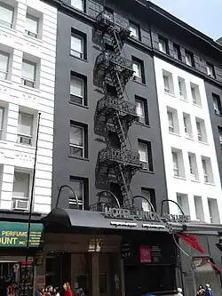 In the 1950s, the hotel was renamed the Golden State Hotel.[1] Personality Hotels purchased the building in the early 1980s and in 1985 reopened it after refurbishment as Hotel Union Square.[4] It was extensively renovated in 2008, when a Dashiell Hammett Suite was created in Room 505.[5] The interior design is by Colum McCartan, along with Lisa Sayed, partner of the hotel interior design company Sisterhood of the Traveling Hotels, who designed the Ring In the Kids Suite. Lisa Compagno designed the Dashiell Hammett Suite. There are 131 guest rooms and suites.