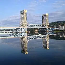 The Portage Lift Bridge spans Portage Lake, which is part of the river and canal system that crosses the entire peninsula, connecting Hancock and Houghton. The bridge, which provides 100 feet (30 m) of vertical clearance for ships when open, is the world's heaviest and widest double-decked vertical lift bridge. Since rail traffic was discontinued in the Keweenaw, the lower deck is used to accommodate snowmobile traffic in the winter. The bridge provides the only link between the north and south sections of the Keweenaw peninsula.[26]