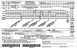 Every driver of a CMV is required to keep track of their time with a log book[18] or an ELD.[19] A log book is simply a notebook with a grid pattern on every page, dividing the 24-hour day into 15-minute (1/4-hour) segments. Drivers are required to make carbon copies of each page, so one page may be kept with the driver (to be produced upon inspection by DOT officers), and so the other copy may be sent to the driver's employer.[18]