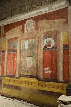 The visible structure consists of two rows of rooms built in opus quadratum, divided into eastern and western sections. The rooms to the western side of this complex may have been the private living quarters and have extensive wall decorations. One room, known as the Room of the Masks, features perspective architectural paintings and theatrical masks, typical of the Second Style of Roman wall painting. Another room features bows of pine, very similar to the House of Livia.[18] These two rooms date to 30 BC.[19]