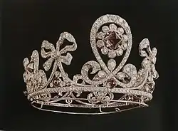 After the revolution, British diplomats helped recover some of the Russian Court jewelry, and the Vladimir Tiara, a diamond diadem with large pearl pendants that originally belonged to Grand Duchess Maria Pavlovna, was bought by Queen Mary, wife to King George V, in 1921.[2][5]