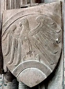 - ^ Original text: "In Gold zwei rote Querbogen, auf deren unterem ein auffliegender blauer Falke steht."