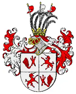In 1644 the white line and the black line united their arms, a griffin claw and unicorn respectively, resulting in a quartered shield. According to family tradition, the three banners in the coat of arms stem from an ancestor, the knight Iwan, who was awarded them by Rudolf I of Germany for having taken them from the enemy in battle against Ottokar II of Bohemia.[9]