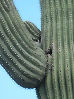 Nest sites are varied, though cavities are preferred. Nests are most frequently built in the eaves and other crevices of houses. Holes in cliffs and banks, and tree hollows, are also used.[141][142] A sparrow sometimes excavates its own nests in sandy banks or rotten branches, but more frequently uses the nests of other birds such as those of swallows in banks and cliffs, and old tree cavity nests. It usually uses deserted nests, though sometimes it usurps active ones by driving away or killing the occupants.[141][143] Tree hollows are more commonly used in North America than in Europe,[141] putting the sparrows in competition with bluebirds and other North American cavity nesters, and thereby contributing to their population declines.[76]