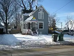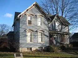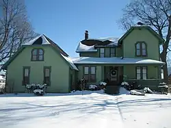 The Charles Kellum House was constructed in 1858 by Charles Kellum. Kellum came to Sycamore in 1855 as an attorney and eventually served in several public offices, including state's attorney and circuit court judge.[5] The house was once a larger structure than it is today. The building at 123 Lincoln Street, directly behind the Kellum House, was separated from the main house, in the 600 block of Somonauk Street, in the 1920s. The house's owner at the time had a daughter who was getting married and he presented the separated wing as a wedding present for the couple.[5] The roof is multiple gabled and features the distinctive Jerkin style roof. Each of the home's gables contain the element, which is a mesh of the gable and hipped roof.