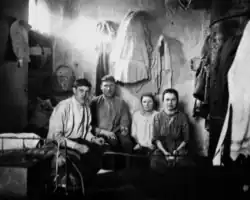 Similar statistics were presented in earlier collections. For instance, according to The National Economy of the USSR for 1913–1956, the urban housing stock of the Russian Empire in 1913 totaled 180 million m², of which 133 million m² was residential space.[6] According to Lyudmila Grudtsyna, in 1913, the average living space per person in Russian cities was 4.5 m², though "actual statistics" indicated a much worse situation.[7] Due to the agrarian economic structure of pre-revolutionary Russia, 82% of the population lived in rural areas, usually in privately owned, low-rise wooden houses (izba) without basic amenities.[8] In major cities, a significant portion of housing consisted of barracks, basements, semi-basements, dormitory-style rooms, dugouts, and semi-dugouts. For example, in Moscow in the 1910s, 327,000 people (the so-called "black tenants") lived in dormitory-style accommodations, accounting for more than 20% of the city's population.[9] The living conditions there were often unbearable[10]: