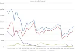 In June 2015 there were approximately 67,000 households in England in temporary accommodation.[75] In autumn 2014 there were around 2,400 rough sleepers in England, 27% of which were in London.[76][77] In 2018 around 320,000 people were homeless in the UK, including children.[78]