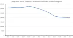 According to official statistics, in October 2015, there were 600,179 vacant dwellings in England, a decline from the 610,123 from a year earlier. Of these vacant dwellings, 203,596 were vacant for more than six months.[93] This, it is believed, is mainly due to financial reasons, such as the owner being unable to sell the house or raise enough money to renovate the property.[94] In November 2017, the government allowed councils to charge a 100% council tax premium on empty homes.[95]