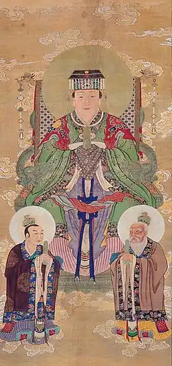 In Taoism, Houtu is one of the Four Heavenly Ministers, along with Jade Emperor, Gouchen Emperor and Ziwei Emperor. In some Taoist scripts, another two gods, Changsheng Emperor and Qinghua Emperor (青华大帝), are added to constitute "Six Heavenly Ministers" (六御). The Daochang of Houtu is at Mount Jiuhua.[8]