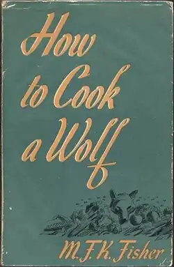 Wolf may be the "best known"[14] of the 20-odd books produced by American food writer Fisher, whose writing has been described as "highly stylized" and so lyrical that she is "basically a Sappho."[15] Nominally about food, home economics, thrift, and preparedness, How to Cook a Wolf has been described "barely a cookbook"[13] and "part experimental cookbook, part 'escape reading material,' and part war protest."[16]