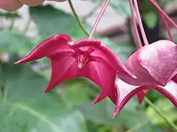 Hoya macgillivrayi is a vine with stems less than 20 mm (0.79 in) in diameter and containing white, milky sap. Its leaves are glabrous, egg-shaped to lance-shaped, up to 200 mm (7.9 in) long and to 80 mm (3.1 in) wide with two to five colleters. The flowers are fleshy, glabrous, flattened bell-shaped, dark reddish-pink, sometimes with a white centre, 55–80 mm (2.2–3.1 in) in diameter with six to ten flowers. Each flower is on a pedicel 54–85 mm (2.1–3.3 in) long and has narrowly oblong lobes 20–25 mm (0.79–0.98 in) long and 19–23 mm (0.75–0.91 in) wide with the edges curved down. The corona has linear lobes 10–12 mm (0.39–0.47 in) long and 2–3 mm (0.079–0.118 in) wide and reddish-pink. Flowering occurs from May to October and the fruit is a follicle about 250 mm (9.8 in) long and 16 mm (0.63 in) wide.[3][4][5][6]