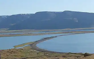 From Hraun, there are good views of Fljót and Skagafjörður. The farm is on a slope overlooking Miklavatn lake and a long isthmus called Hraunamöl between the lake and the sea from which people used to fish. There is an inlet called Hraunakrókur north of Hraunamöl[3] where a polar bear turned up on and was killed in 1870.[2] The major road to Siglufjörður went, and still goes, by Hraun—previously up Hraunadalur valley through Siglufjarðarskarð—but now through Alemenningar road and Strákagöng tunnel; it used to be heavily trafficked.[4] In the late 19th century, a clothing store was established there, which later relocated to Haganesvík.