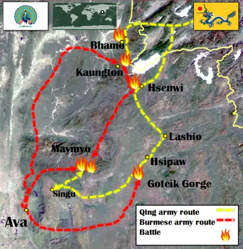 But the Burmese were caught flat-footed in November 1767, when a 50,000-strong force led by the elite Manchu Bannermen invaded again. The main Chinese army defeated the main Burmese army in December 1767 at the Battle of Goteik Gorge, prompting Hsinbyushin to finally recall his remaining garrison forces from Siam. The main Chinese army overran Burmese defenses and reached Singu, 30 miles north of Ava around late January 1768. Hsinbyushin to his credit never lost composure, and personally organized the defenses. Bolstered by the reinforcements returning from Siam, the Burmese forces defeated the main Chinese army in March 1768 at the Battle of Maymyo.