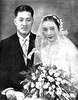In 1931, a cousin introduced Hu Die to Pan Yousheng (潘有声), a young employee of a Shanghai trading firm. Hu Die was careful about her personal life and their relationship progressed slowly until autumn 1935, when they announced their impending marriage. Their wedding was the most important social event in Shanghai of that year. Famous film stars served as bridesmaids and groomsmen, and child stars were their flower girls and page boys.[10] Hu Die was ready to retire from the film industry, as was customary at the time after an actress' marriage, but with her husband's support, she signed a contract with Mingxing to make one film per year. She only made one more film under the new contract, before the Second Sino-Japanese War broke out, and the hard-fought Battle of Shanghai completely destroyed Mingxing and other Shanghai studios in 1937.[10]