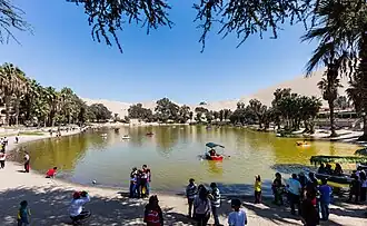 Huacachina is a village built in a small artificially maintained oasis and surrounded by sand dunes in southwestern Peru. It is about five kilometers from the city of Ica in the Ica District of Ica Province.[1] The oasis was introduced as a feature on the back of the 50 nuevo sol note in 1991. Huacachina has a permanent population of around 100 people,[2] although it hosts many tens of thousands of tourists each year.