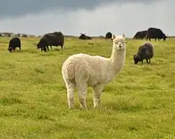The Huacaya alpaca is a breed of alpaca (Lama pacos) that has a unique appearance and fiber quality.[1] This breed is the most popular alpaca breed with population numbers reaching 2.8 million in Peru alone.[2] They share biological components with other species in the Camelidae family. Their digestive tract, nutrition requirements, and herd behavior mirror that of all camelids. They also survive amidst similar predation, poison, and disease threats that endanger all camelids alike.