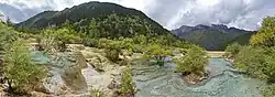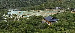Huanglong (simplified Chinese: 黄龙; traditional Chinese: 黃龍; pinyin: Huánglóng; lit. 'yellow dragon') is a scenic and historic interest area in the northwest part of Sichuan, China. It is located in the southern part of the Minshan mountain range, 370 kilometres (230 mi) north-northwest of the capital Chengdu.[1] This area is known for its colorful travertine pools formed by calcite deposits, especially in Huanglonggou (Yellow Dragon Gully), as well as diverse forest ecosystems, snow-capped peaks, waterfalls and hot springs. Huanglong is also home to many endangered species including the giant panda and the Sichuan golden snub-nosed monkey.[1] In addition, a large population of the endemic orchid species 'Cypripedium plectrochilum' was discovered at the site.[2] Huanglong was declared a World Heritage Site by UNESCO in 1992 because of its outstanding travertine formations, waterfalls and limestone formations as well as its travertine terraces and lakes rating among the three most outstanding examples in the world.[1][3]