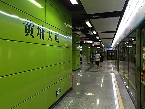 Huangpu Dadao station (Chinese: 黄埔大道站), literally Huangpu Avenue station, formerly Huangpu Avenue West station (黄埔大道西站) and Citizens' Square station (市民广场站), is a Guangzhou Metro APM line metro station in the Zhujiang New Town of Tianhe District. It is located at the underground of the West Huangpu Avenue,[1] Zhujiang Road East,[2] and Zhujiang Road West.[3][4] It started operating on 8 November 2010.[5][6]