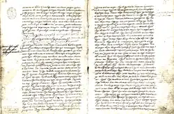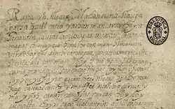 The Huarochirí manuscript is the only surviving written source that records a prehispanic religious tradition of the Andes in an Andean language. As it was recorded decades after the entry of European colonists into the region, the retellings of these religious traditions were influenced by the preceding seventy years of colonial turbulence, including forced conversion and persecution.[2] The manuscript was recorded and annotated by the Cuzco-born cleric Francisco de Ávila, who was responsible for the eradication of pagan beliefs – it is therefore considered ironic that the manuscript now preserves these very beliefs.[1] The manuscript serves as a complex composite of testimonies and social memories, and the exact process of composition is unknown.[2] It also contains many crossing-outs, tangents and marginal queries, likely those of Francisco de Ávila. It has been argued by Jorge Sanchez-Perez, Assistant Professor of Philosophy at the University of Alberta, that de Ávila's purpose was to use the myths recorded to prove the supposed superiority of the Christian faith, and to profess that he had been given foresight of these beliefs when attempting the conversion of indigenous peoples.[3] The work of Huarochirí specialist Sarah Bennison of the University of St Andrews argues that both the colonial Huarochirí Manuscript and the twentieth-century Entablo Manuscript are intimately tied to khipu ('quipu') accountancy.
