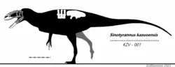 Using an updated version of this matrix, Cau and Paterna (2025) determined that Sinotyrannus, a large coeval tyrannosauroid known from a specimen of an adult individual, was a mature form of Huaxiagnathus. Both species share a dorsally convex ilium with a short preacetabular process without an anteroventral hook. Other differences observed between the two species are likely the result of differences in body size and ontogenetic stage, consistent with the more established growth series of other tyrannosauroids like Tyrannosaurus. Since Huaxiagnathus was named before Sinotyrannus, this genus name holds priority, making Sinotyrannus a junior synonym of the former.[3]