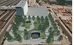 The boulevard is split into two, with a Hudson Boulevard East and a Hudson Boulevard West. The park serves as a median.[18] The boulevard starts from a restricted driveway (extending from 31st Street westbound) at 33rd Street and is one-way northbound to 35th Street, with the park to the west of the roadway. North of 35th Street, a southbound roadway forms and the park is located between the two roadways up to 36th Street. Future plans call for the park to be extended up to 39th Street (although the western roadway ends at 38th Street, the eastern roadway and the park go up to 39th Street). Then, a High Line-style promenade above the Lincoln Tunnel entrance will be constructed in the second phase to connect the greenway to 42nd Street.[13][19] The boulevard's southern end is integrated with the Hudson Yards Public Square, an L-shaped public square that is intended to be Hudson Yards' centerpiece.[20]