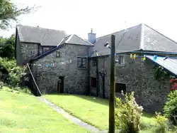 Townhouse Barton, south front, in 2015. The textured concrete rendering and concrete window cills hide a former Devon "mansion" of considerable age containing a fine 17th century decorative plasterwork ceiling in the ground-floor room of the east annex at right